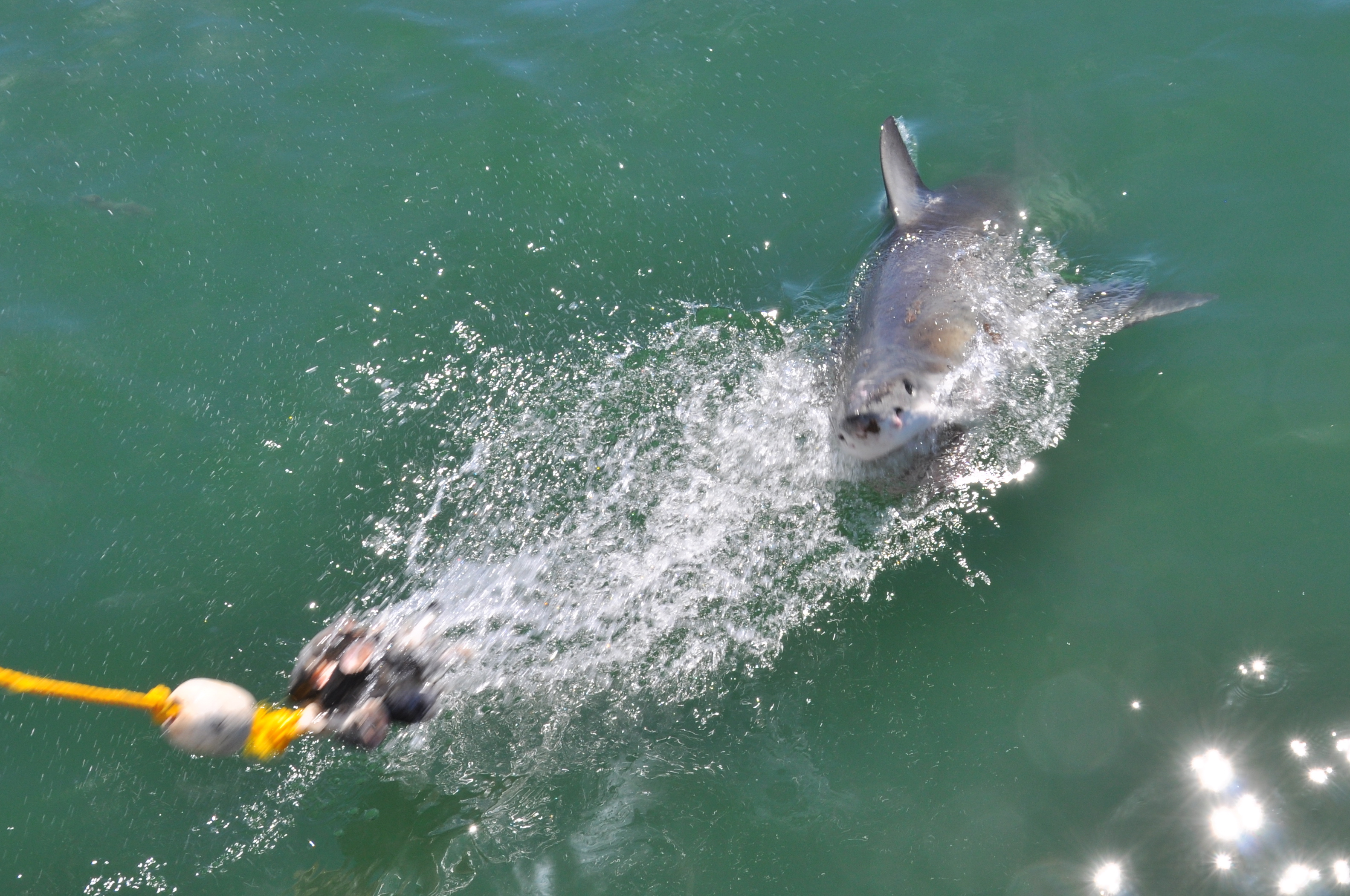 When our time was up, we all climbed out of the cage and the next group climbed in behind us.  Immediately after they closed the cage, a huge and very fast shark managed to grab the fish-on-a-rope. A vicious tug-of-war ensued, as the shark thrashed and spun about, slamming into the cage.