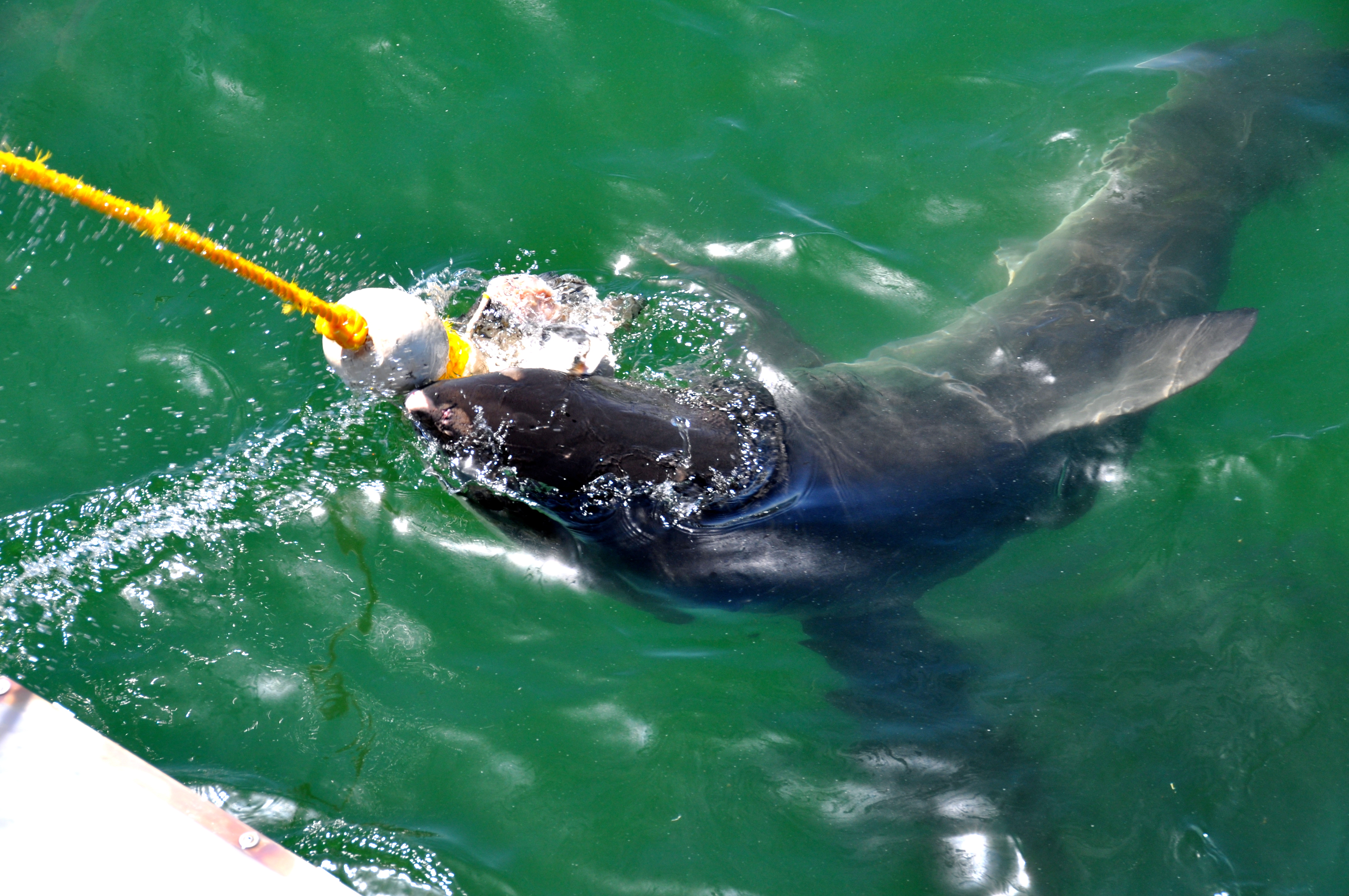 Who’s first, we all wondered.  The crew began calling out names, handing out our wet suits and putting us into groups.  Luckily, we were not in the first batch.  I needed to see if they survived before I stuck my tootsies into that water.  As the first group entered the cage, the crew tossed a batch of dead fish tied to the end of a rope into the water.  They also had a wooden form that supposedly looked like a small seal, at least to a shark.  Within minutes, the first sharks arrived as the crew taunted them with the fish-on-a-rope.  As the sharks got close to the fish, the crew yanked it away, in an effort to draw the sharks closer to the cage.