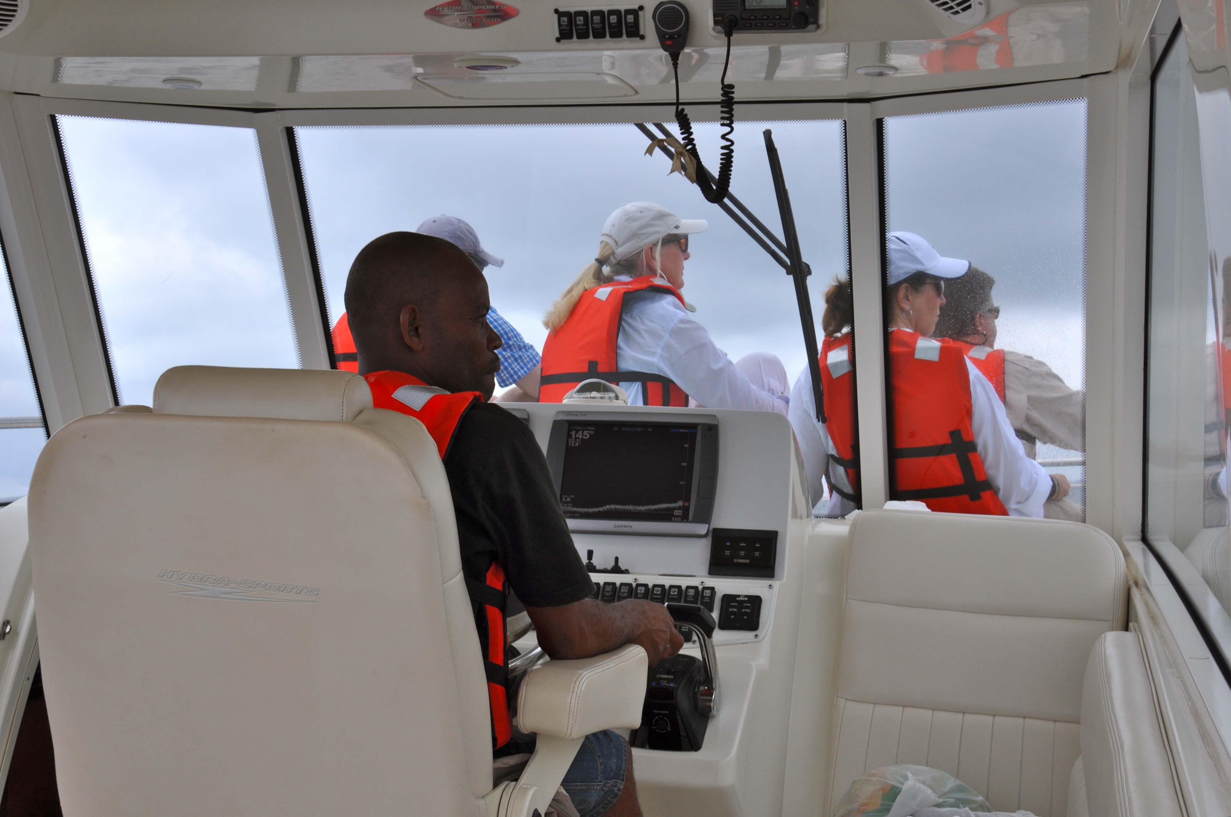 For our second trip, we were blessed with more sunny, cool weather. After cruising around for about a half hour, one of our boat motors started making a rattling noise and had to be shut off. The boat has three motors in total, so there was no worry about getting back, but we all knew that this breakdown would take the boat out of commission for several months. In fact, it takes so long to get parts brought in, that it could be well into October before it is up and running again. The second company boat is also broken, and has been for some time, so this could be our last boat ride for awhile.